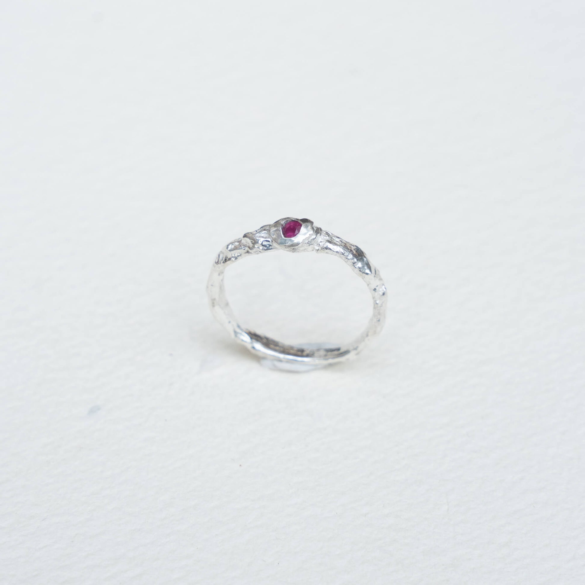 El rubí brilla con un rosa intenso y profundo, como una chispa de pasión congelada en piedra.